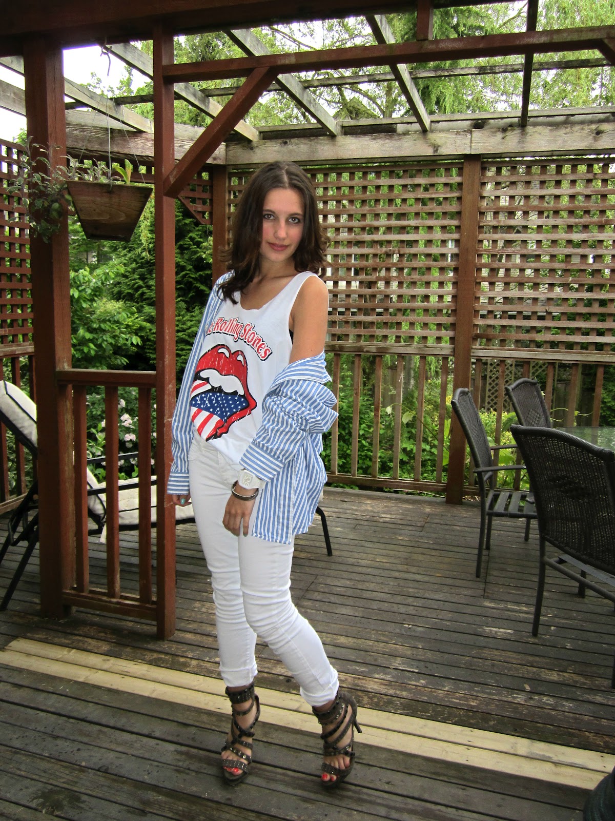 Rolling Stones tee from thailand as a gift from my best friend, Dynamite jeans, American Eagle shirt, Joe Fresh watch, Friis and Company heels